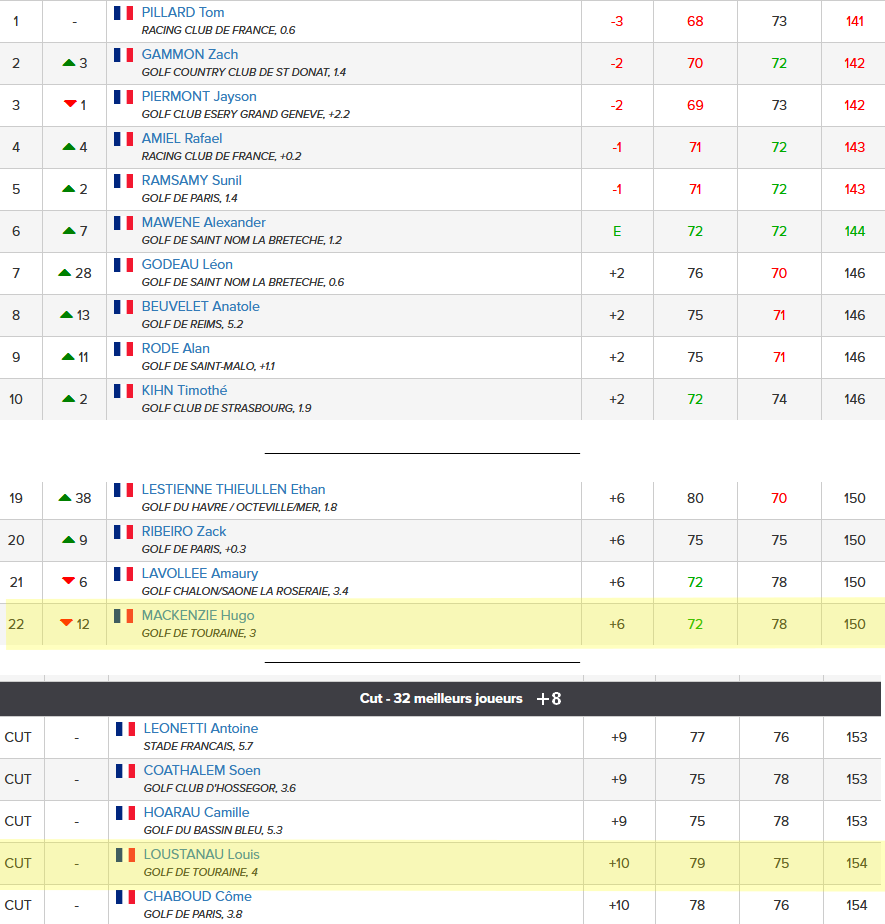 Après ces 36 trous, c’est Hugo qui s’est en le mieux sorti. Avec une très belle carte de 72 le premier tour et une deuxième de 78, il a fini 22ème et a passé le cut.