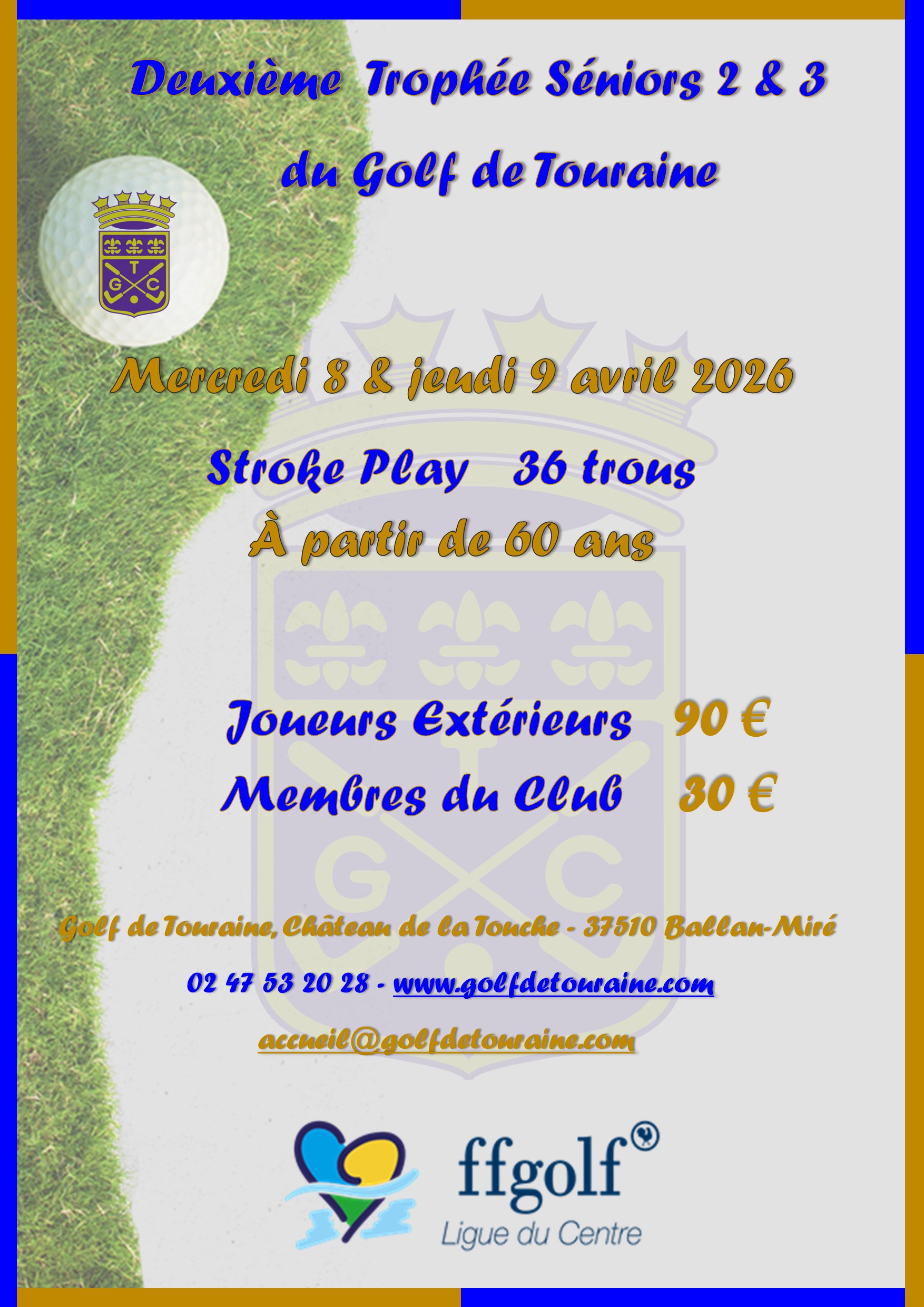 Trophée Séniors 2&3 Trophée Séniors 2&3 du Golf de Touraine Le Golf de Touraine organise son deuxième Trophée Séniors 2 et 3 (plus de 60ans) les mercredi 8 et jeudi 9 avril 2026. Règlement de l’épreuve à venir Inscription via HelloAsso ⬇